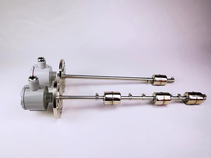 干簧管式浮球液位計工作原理:干簧管式浮球液位計由浮球、插桿等組成。浮球液位計通過連接法蘭安裝于容器頂上,浮球根據(jù)排液體體積相等等原理浮于液面,當容器的液位變化時浮球也隨著上下移動,由于磁性作用,浮球液位計的干簧受磁性吸合,把液面位置變化成電信號,通過顯示儀表用數(shù)字顯示液體的實際位置,浮球液位計從而達到液面的遠距離檢測和控制。浮球變送器上的浮球隨液位上下浮動,使傳感器得到正比于液位的電阻信號,經(jīng)轉(zhuǎn)換放大變送輸出DC4 -20mA的標準信號??膳c多種二次儀表或計算機構成對液位進行遠距離調(diào)節(jié)的測量,顯示和控制系統(tǒng)。